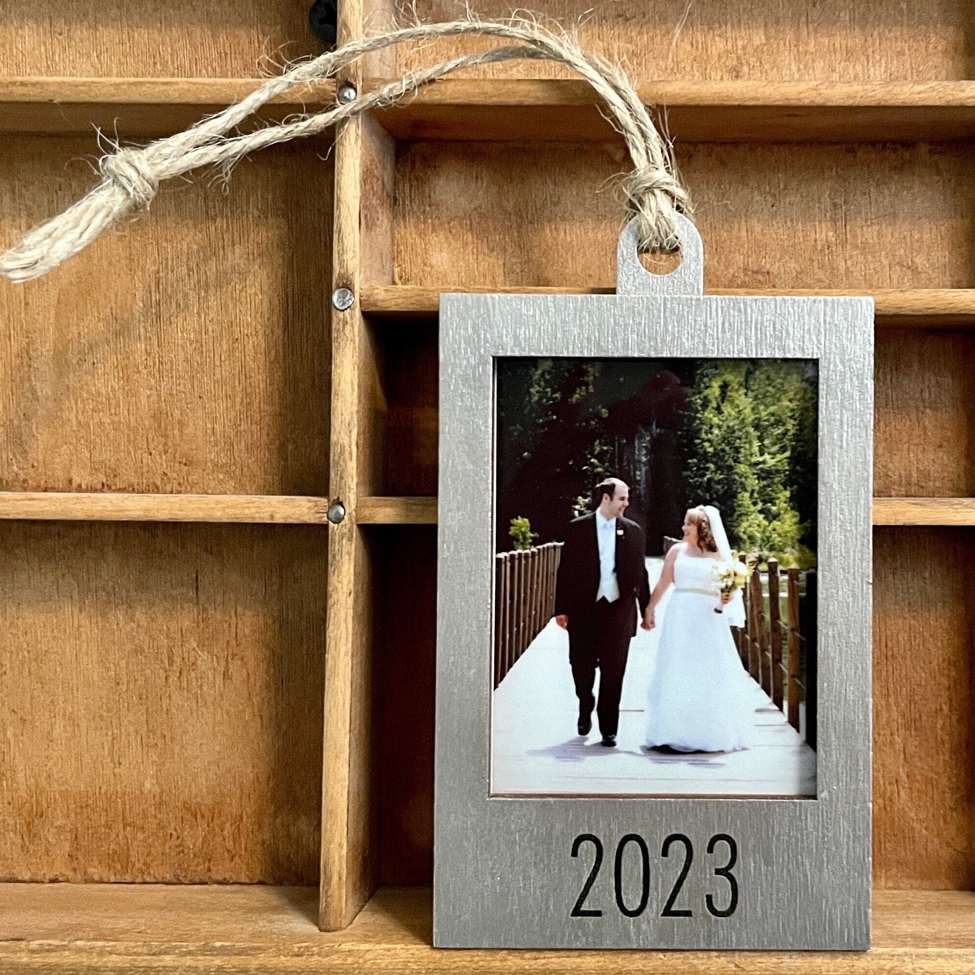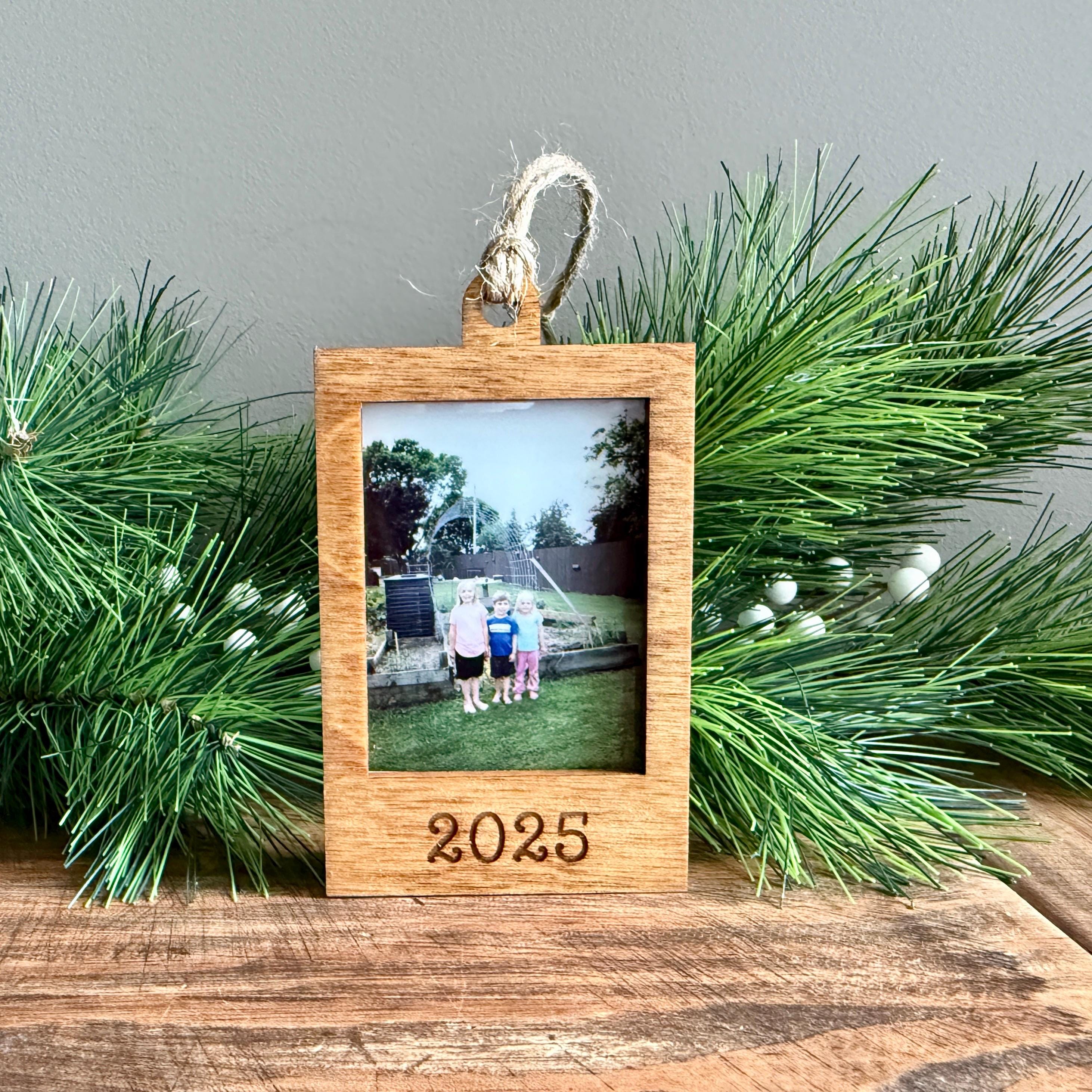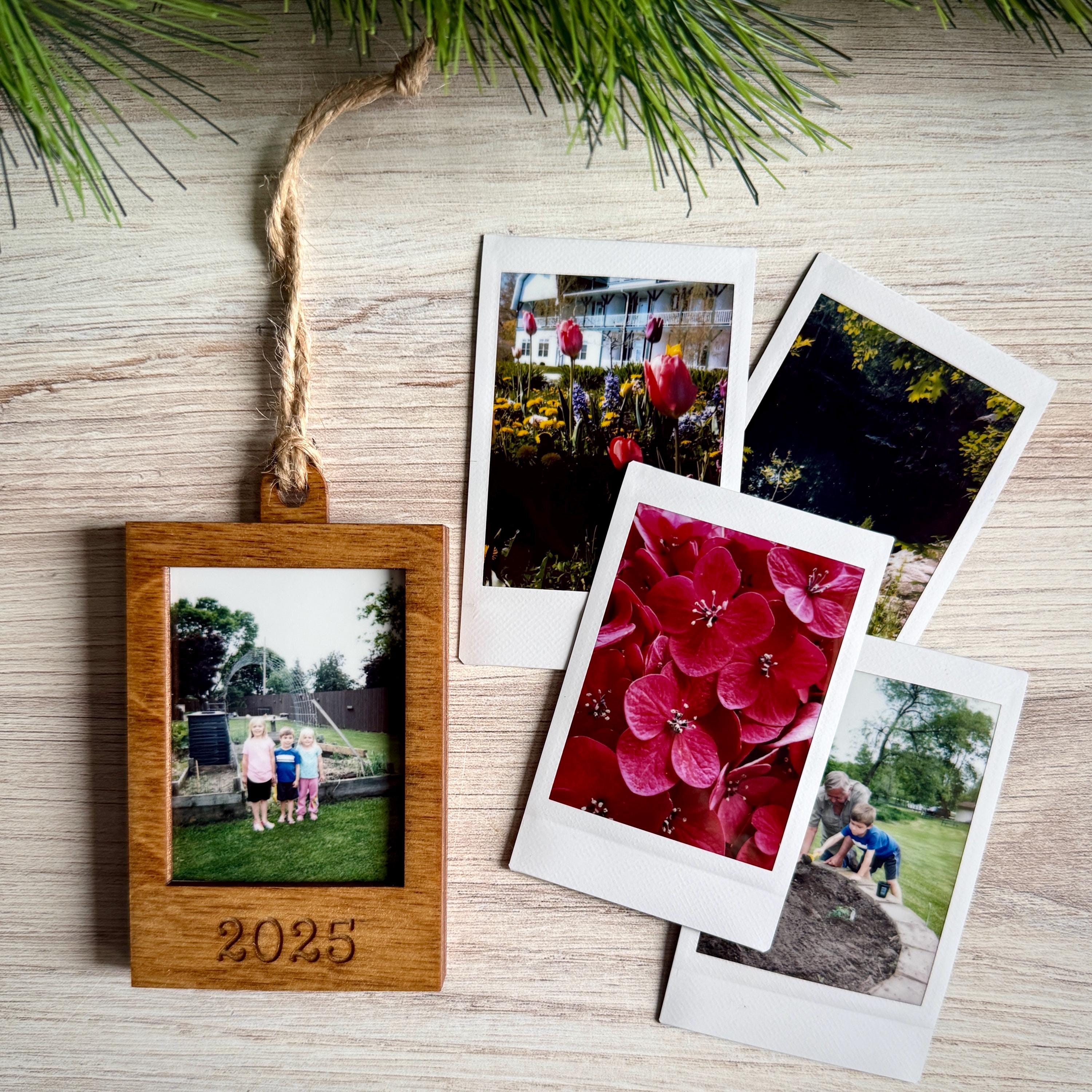 We've taken our custom designed and laser cut drop-in style frame ornaments that perfectly display Instax Mini photos (measuring 2 1/8" wide by 3 3/8" high) and will engrave the year of your choice!