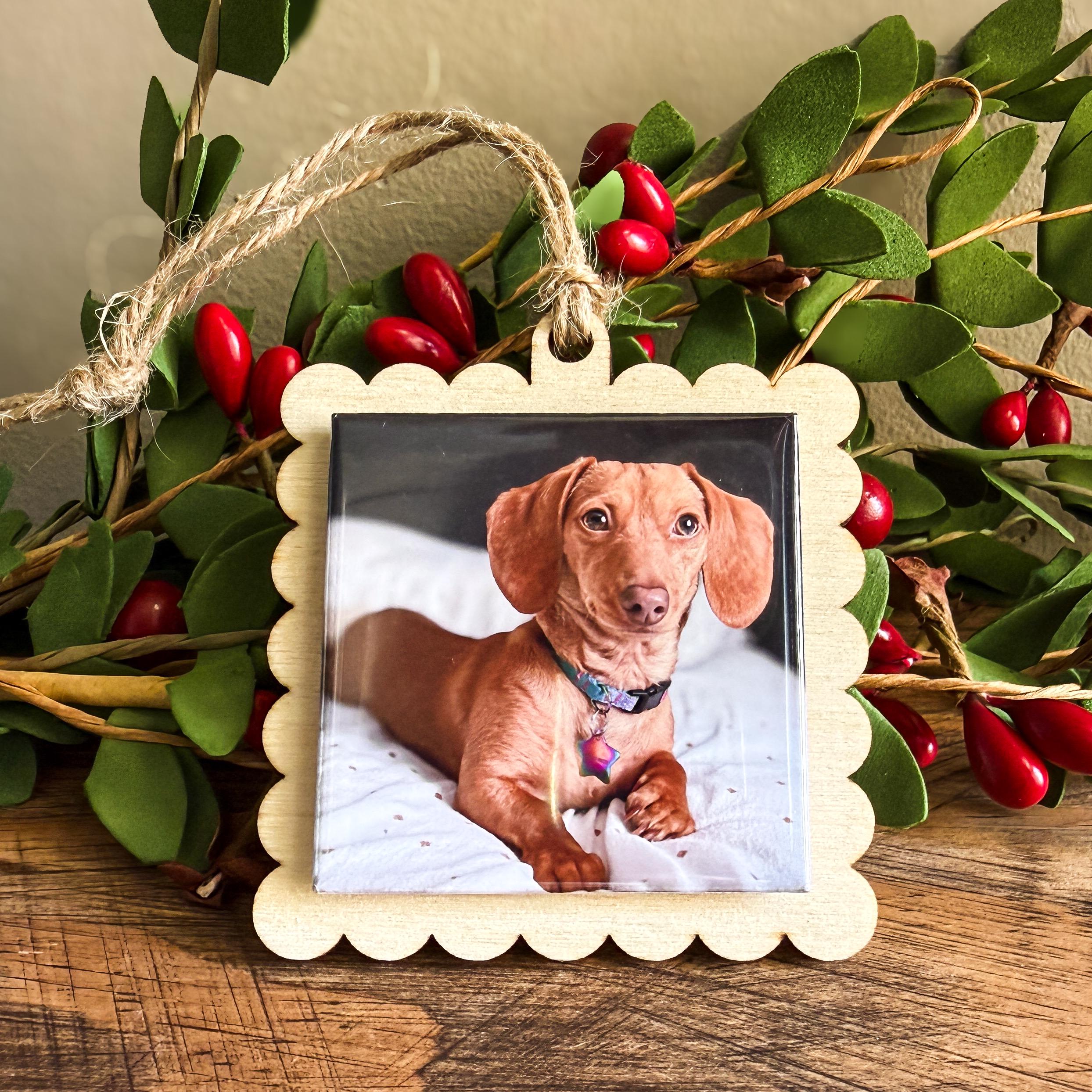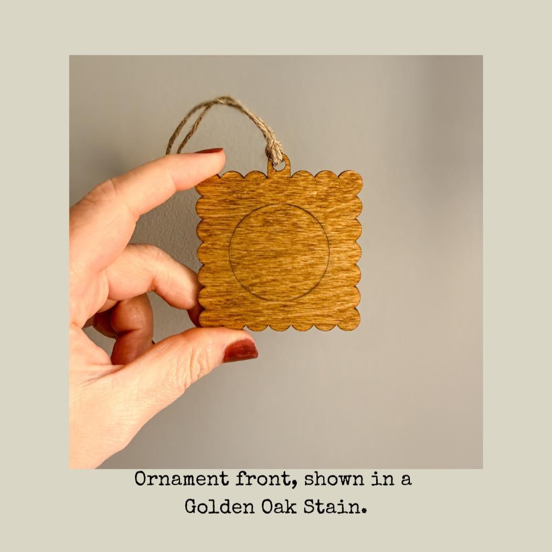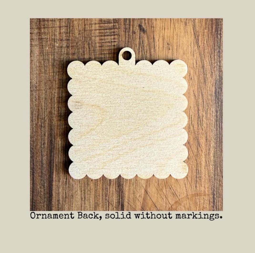 Custom designed and laser cut by us, these wooden ornaments measure approx. 2.5" square and perfectly fit 2" Square Photo Magnets. Backers are 1/8" thick and made with quality Birch wood, milled in MN. Ornament backers are sanded smooth and otherwise unfinished ready for paint or stain if you choose.