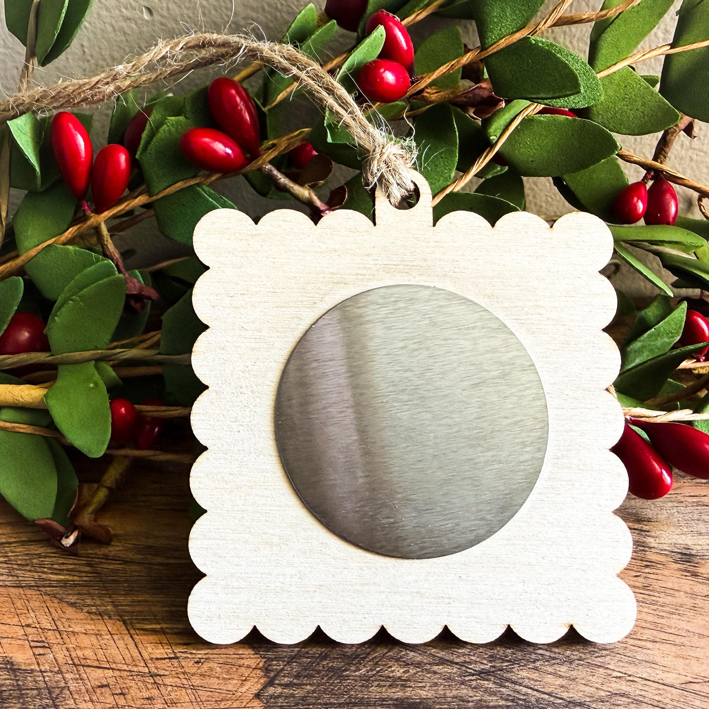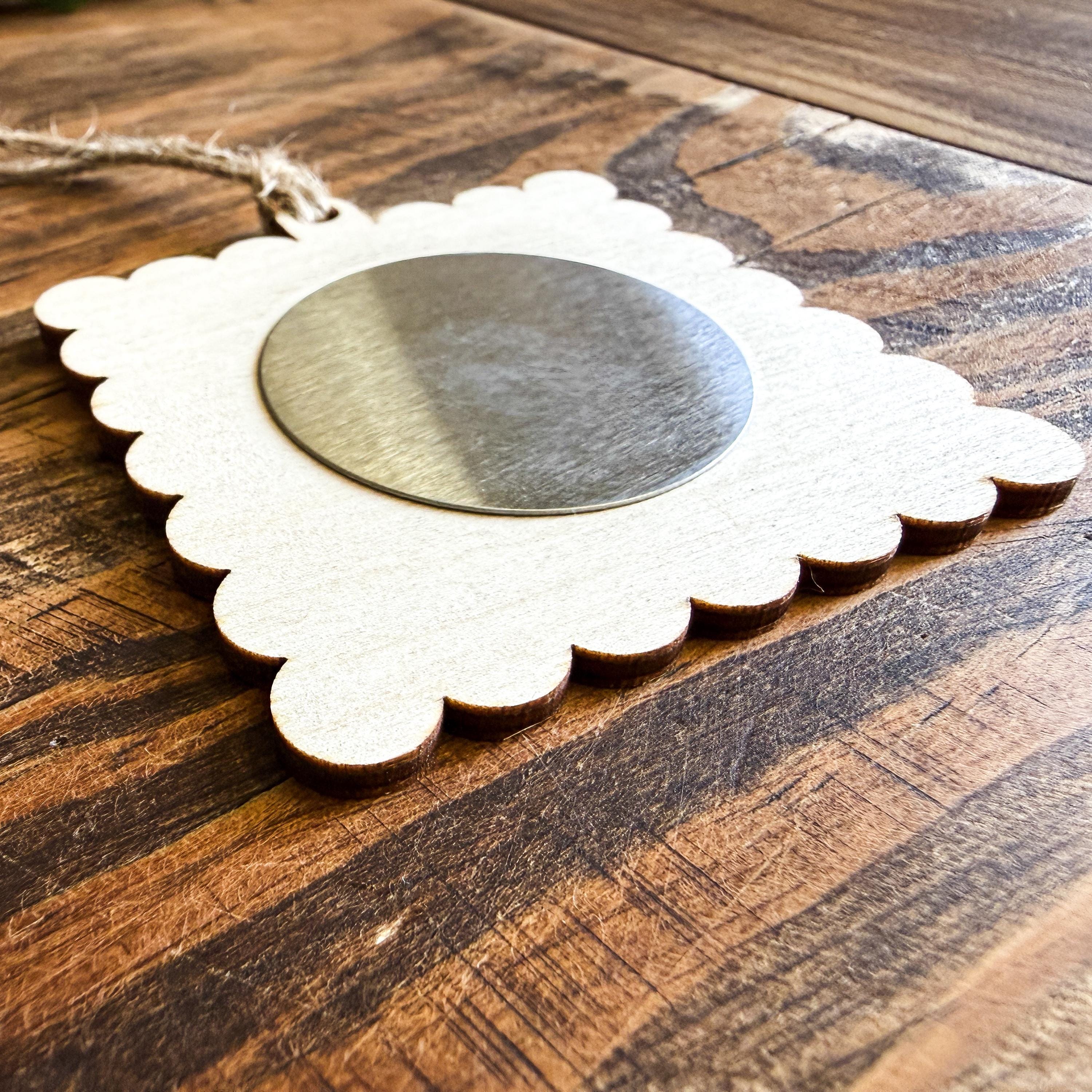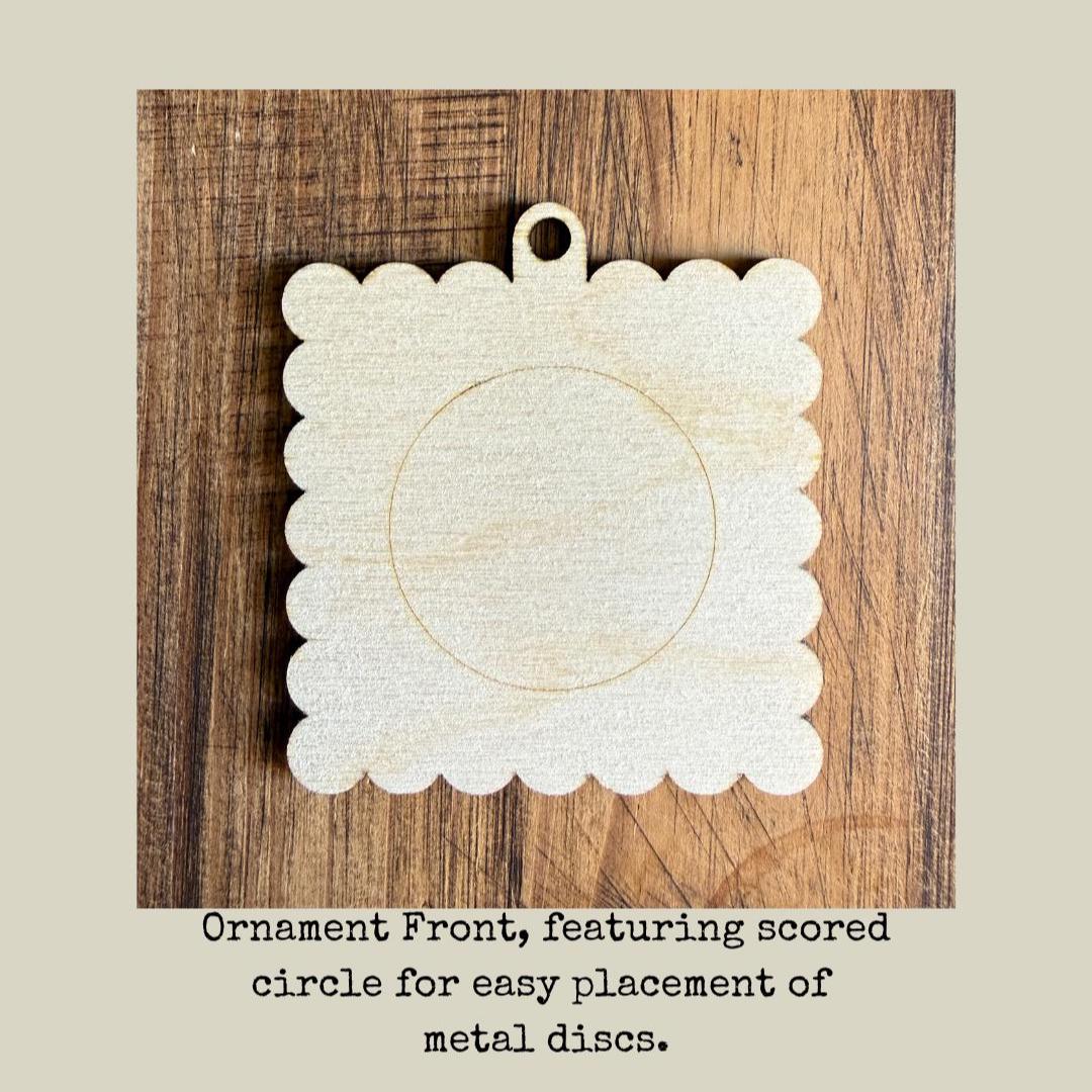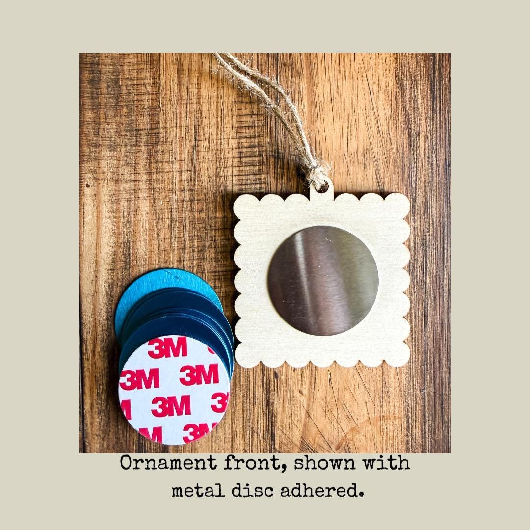 *Only the wooden backer is provided. We recommended adhering these adhesive metal discs (affiliate link: https://amzn.to/4nECqaE ) to the backers so your magnets will have a metal surface to mount to. Ornament backers have a light outline in the center (as seen in the 4th photo), to provide a guide for adhering the metal discs. The back of the ornament is plain without any markings.