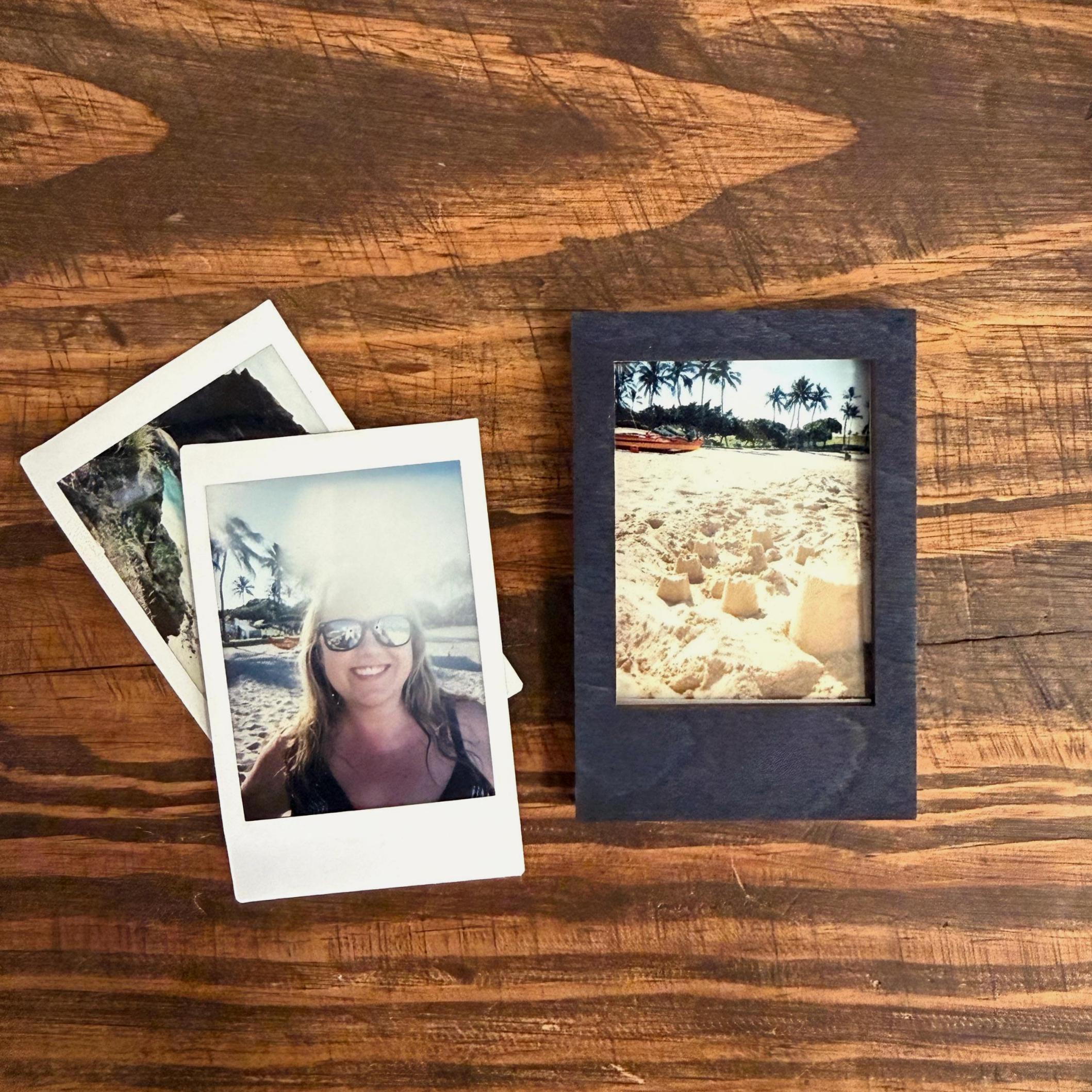 We have custom designed and laser cut a drop-in style frame to display Instax Mini photos (3 3/8" x 2 1/8"). You can also use any photo of your choice by cutting it down to fit using the cardstock template we have included with your frame.